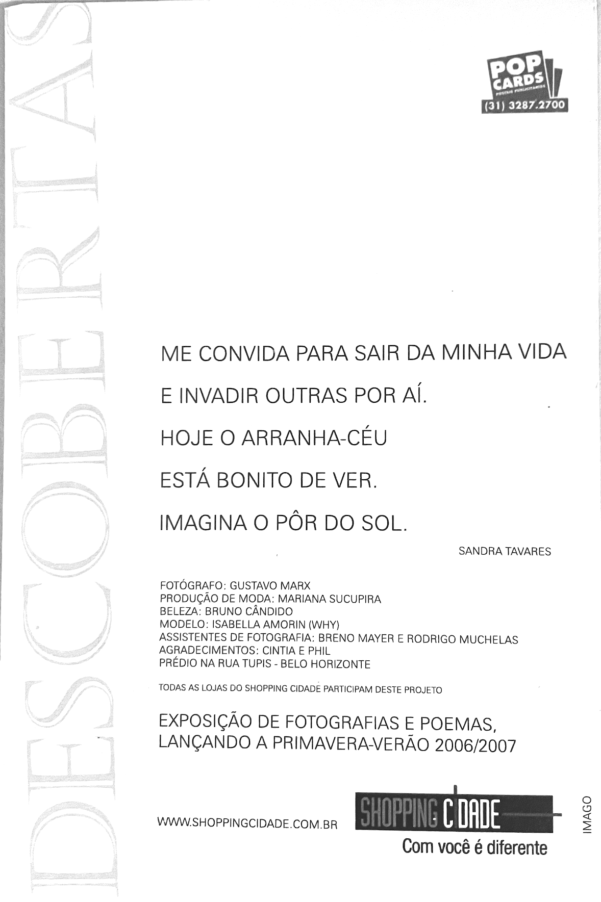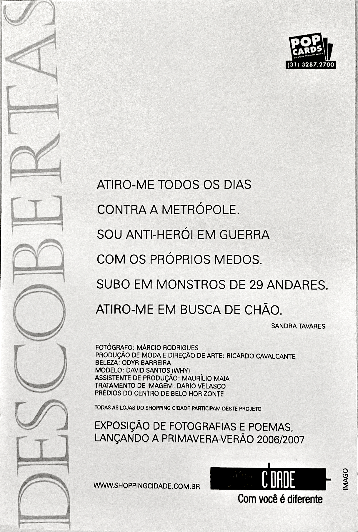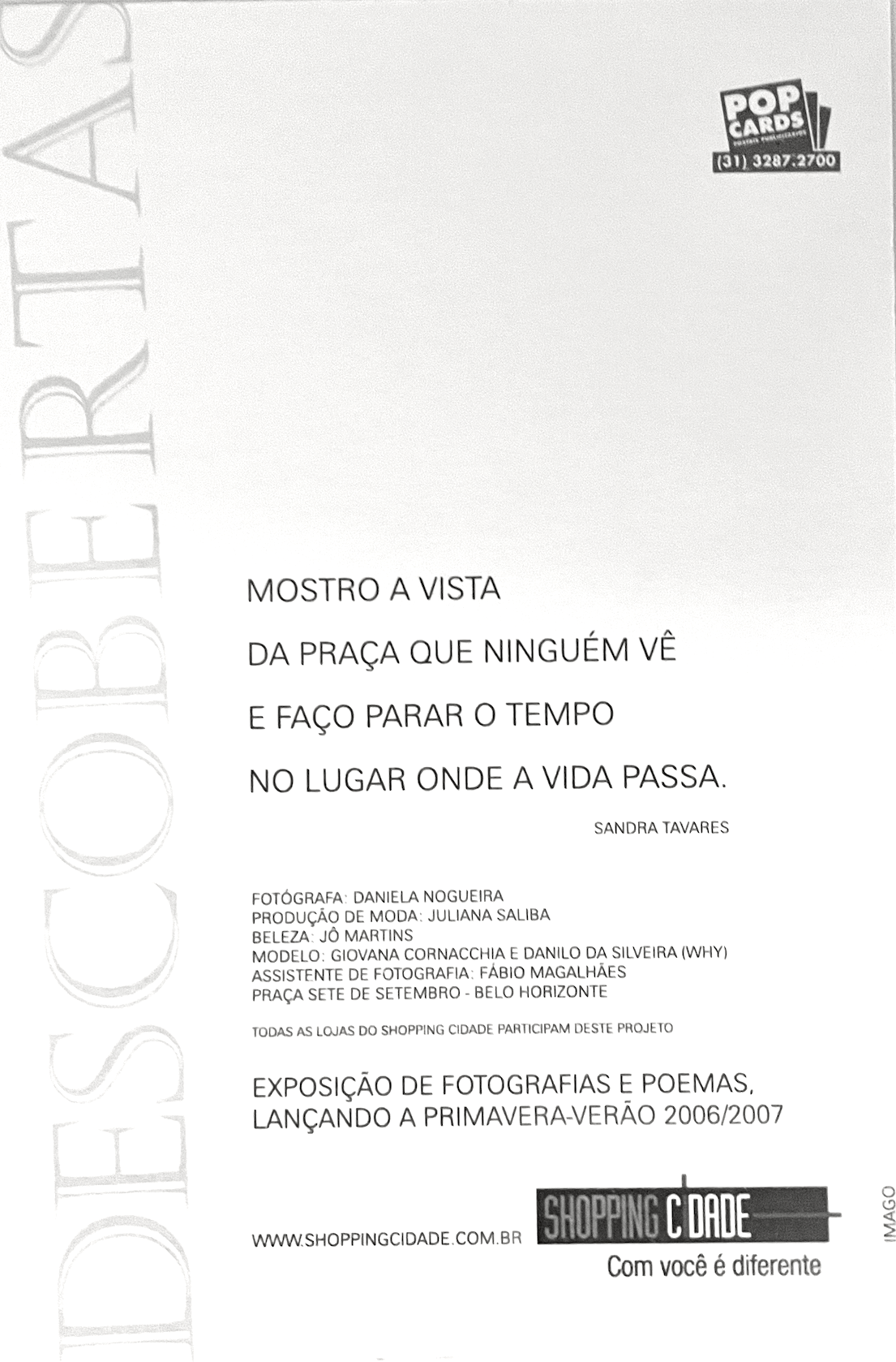 A valorização do centro da capital mineira foi a principal tônica do lançamento da temporada de moda primavera-verão do Shopping Cidade. Ao invés dos tradicionais desfiles e catálogos, o marco da campanha será uma exposição de fotos e poemas, intitulada “Descobertas”, em cartaz de 14 a 30 de setembro, no mall central do piso Tupis no Shopping.